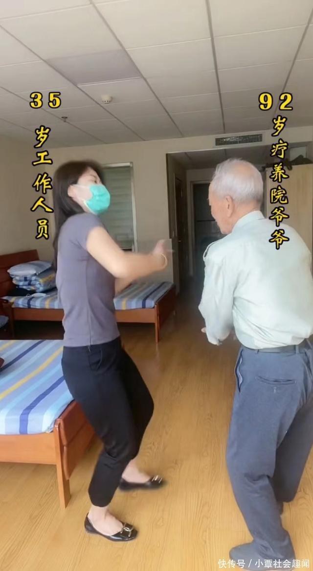 “养老院里,35岁的女护理员尽心尽责照顾老人,替他的健康着想,想让他早日养好身体,还跳舞给他看,最后演变成两人一同跳舞,场面和谐。”