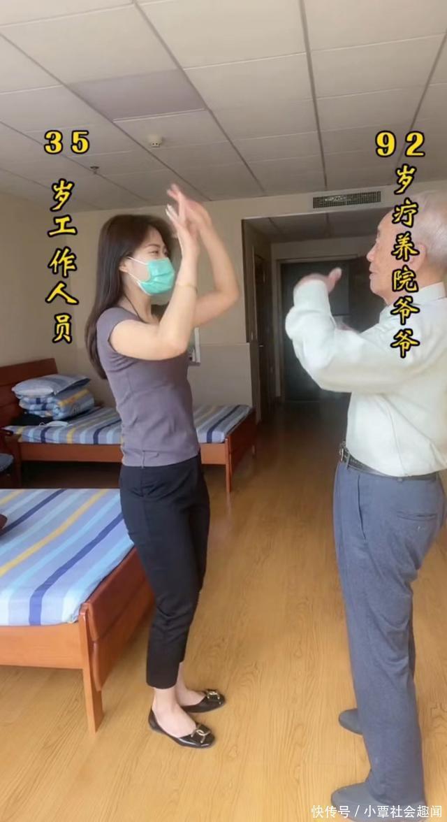 “养老院里,35岁的女护理员尽心尽责照顾老人,替他的健康着想,想让他早日养好身体,还跳舞给他看,最后演变成两人一同跳舞,场面和谐。”